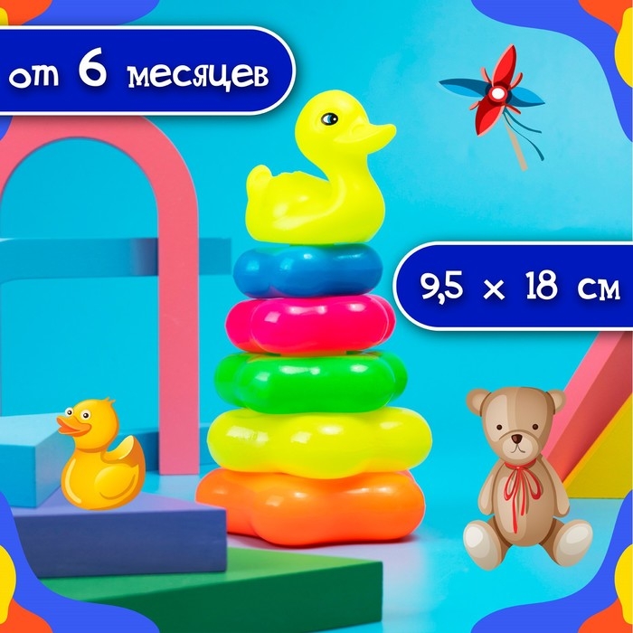 Пирамида «Уточка», 5 колец ― одна из первых логических игрушек крохи. С её помощью у ребёнка формируется представление о цветах и размерах предметов, развиваются базовые счётные навыки. Малыш учится сравнивать элементы по общему признаку и собирать их в одно целое.