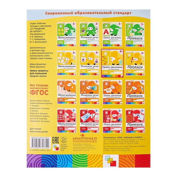 Рабочая тетрадь «Уроки грамоты для малышей», средняя группа, Денисова Д., Дорожин Ю.