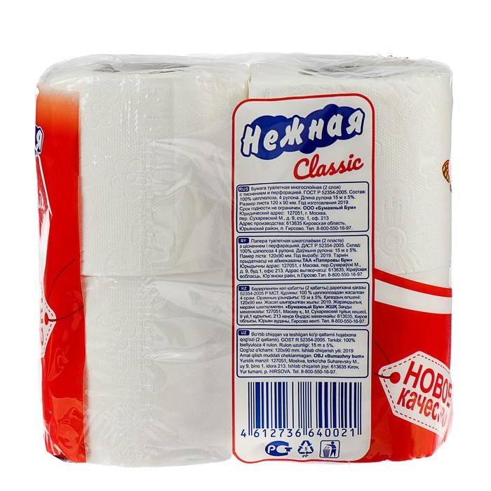 Туалетная бумага "Нежная", с втулкой, 2 слоя, 4 рулона