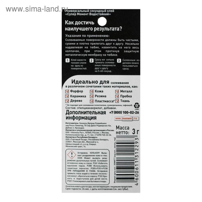 Супер Момент Водостойкий отлично склеивает широкий спектр материалов. Это надежный и стойкий прозрачный секундный клей, особо устойчивый к воздействию воды и растворителей. Выдерживает прямое воздействие воды в течение 3-24 часов.