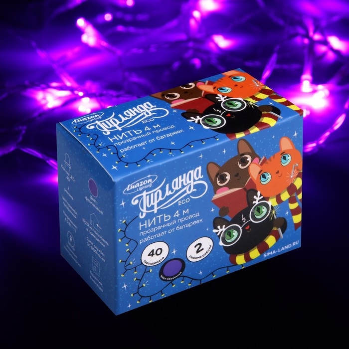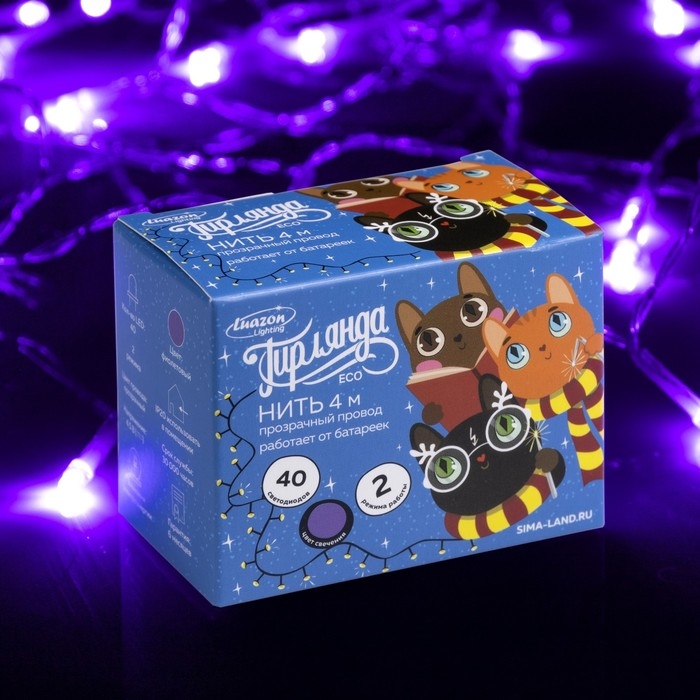 Гирлянда «Нить» 4 м, IP20, прозрачная нить, 40 LED, 2 режима, батарейки AAх3 (нет в комплекте) , свечение фиолетовое