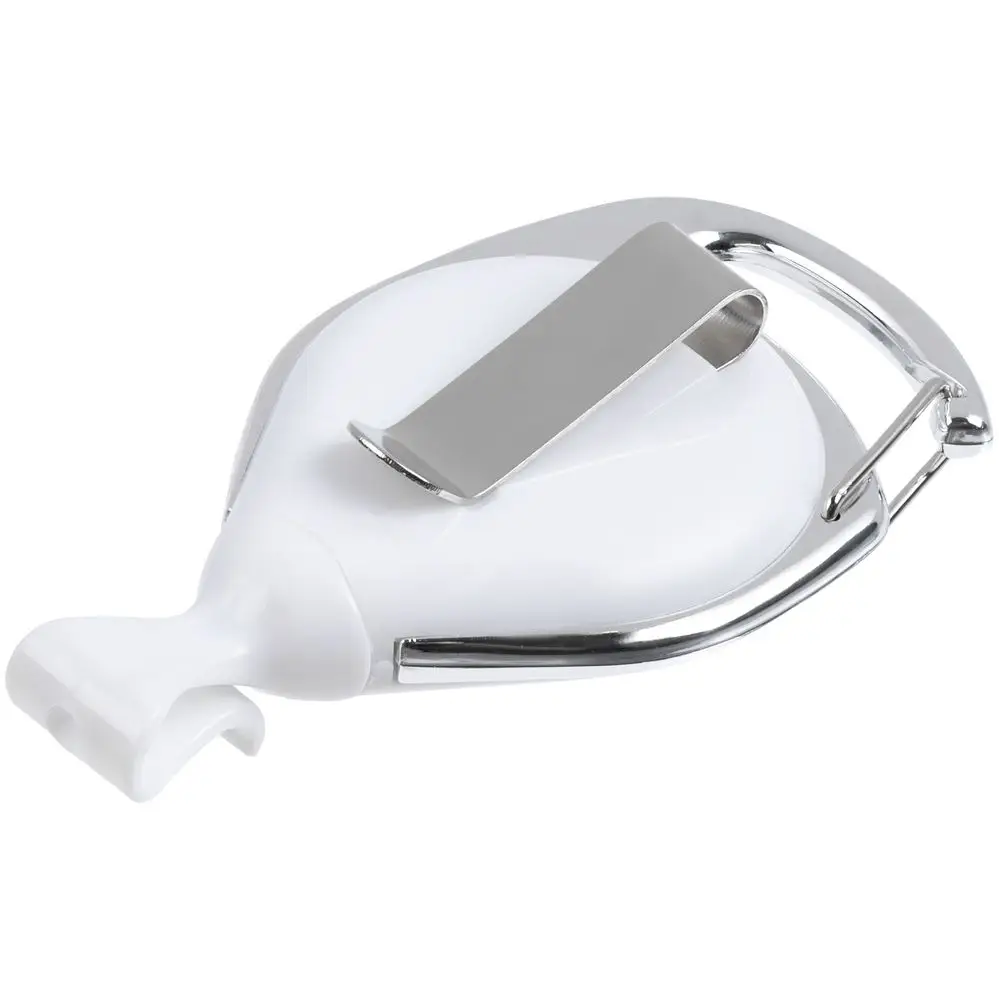 Ретрактор крепится к одежде с помощью клипа или карабина, а с другой стороны на можно подвесить бейдж, пропуск или магнитную карту. В корпусе спрятан сворачивающийся шнур, который позволяет при необходимости демонстрировать содержимое держателя, не снимая его.