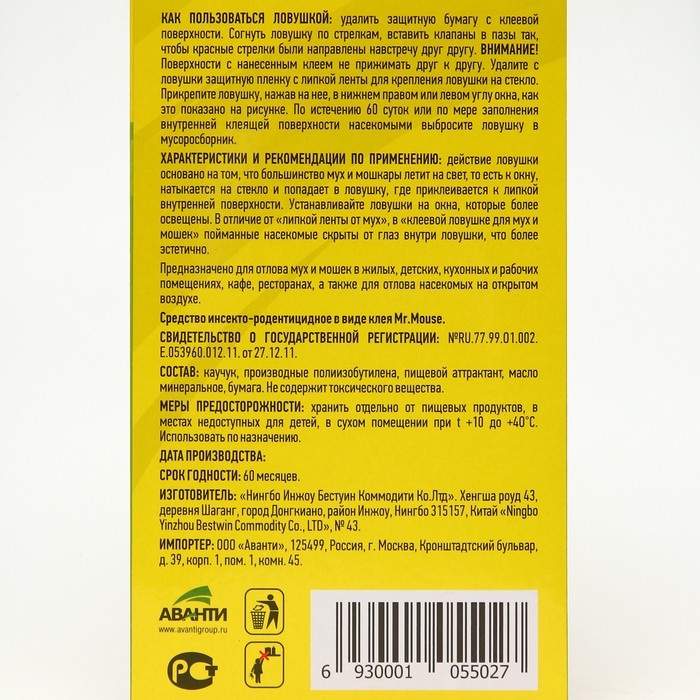 Экологически чистый продукт. Не содержит отравляющих веществ, без запаха. Не оставляет следов после удаления со стекла и других поверхностей. Эффективность ловушки — до 6 месяцев.