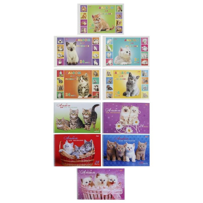 Альбом для рисования А4, 24 листа, на гребне, "Милые котята" обложка мелованный картон, блок 100 г/м², перфорация на отрыв, МИКС