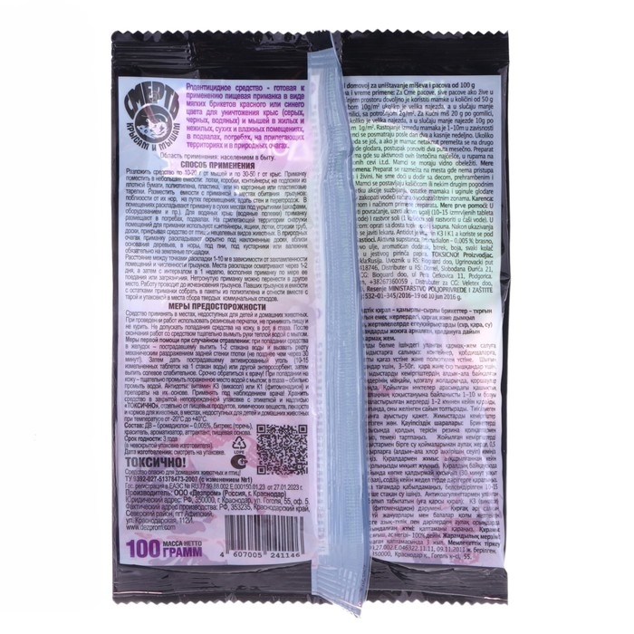 Назначение: для уничтожения крыс (серых, черных, водяных) и мышей в быту, а также в организациях, имеющих право заниматься дезинфекционной деятельностью.