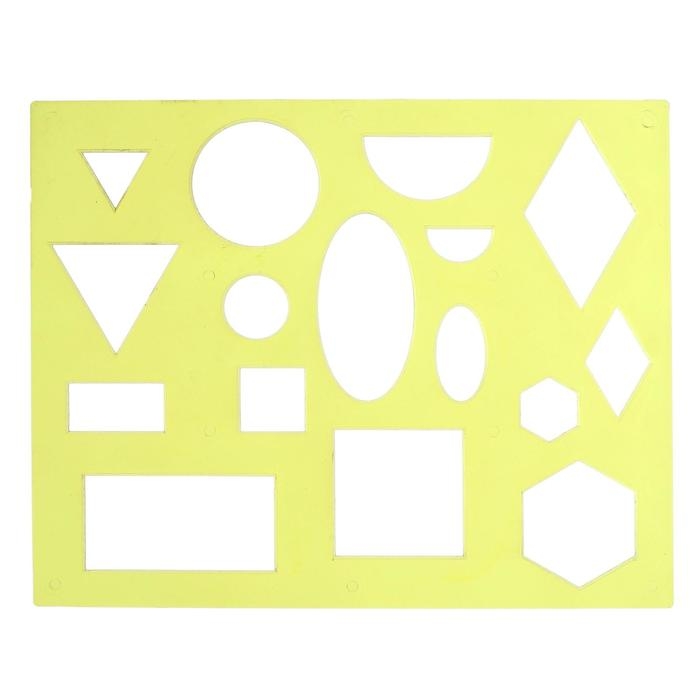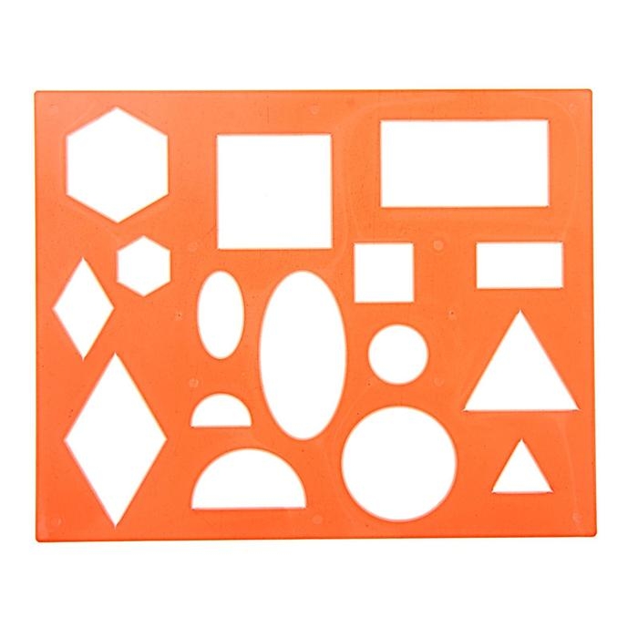 В трафарете вырезаны такие фигуры, как: круг, овал, полукруг, ромб, квадрат, прямоугольник и шестиугольник, которые встречаются дважды в разных размерах. Трафарет позволяет ребенку выучить названия и вид различных фигур, одновременно развивая мелкую моторику и навыки рисования, а также может применяться для оформительских работ.