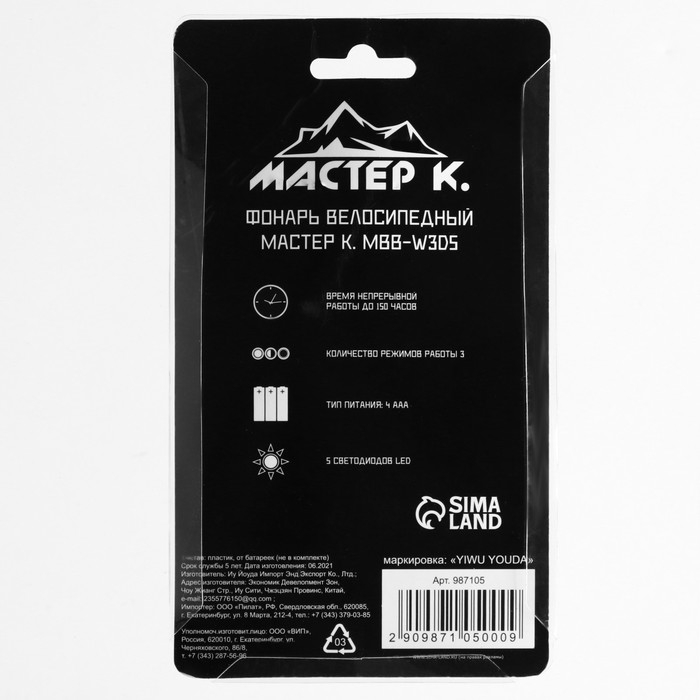 Фонарь велосипедный передний "Мастер К", водонепроницаемый, 5 диодов, 3 режима, 4ААА
