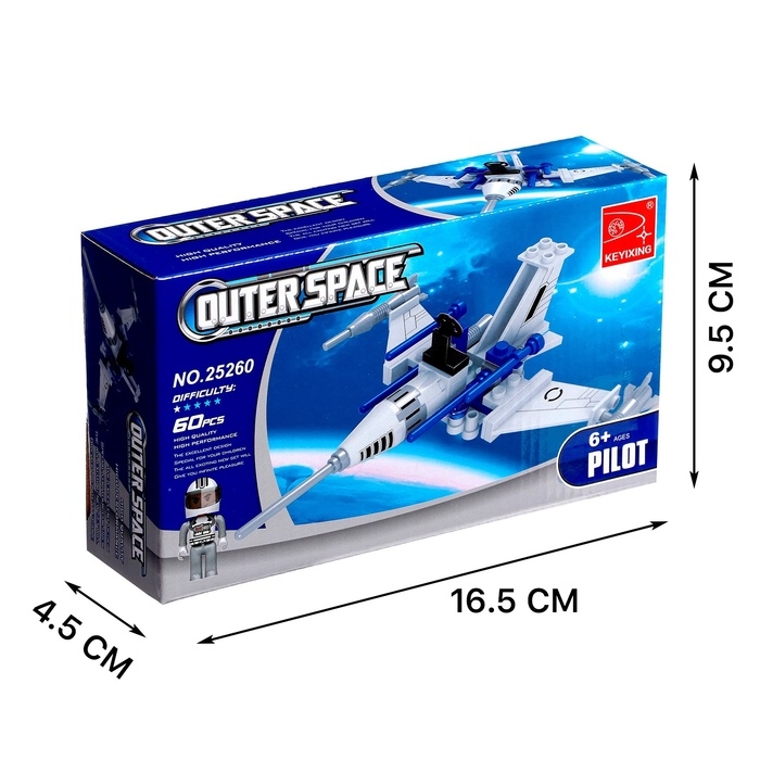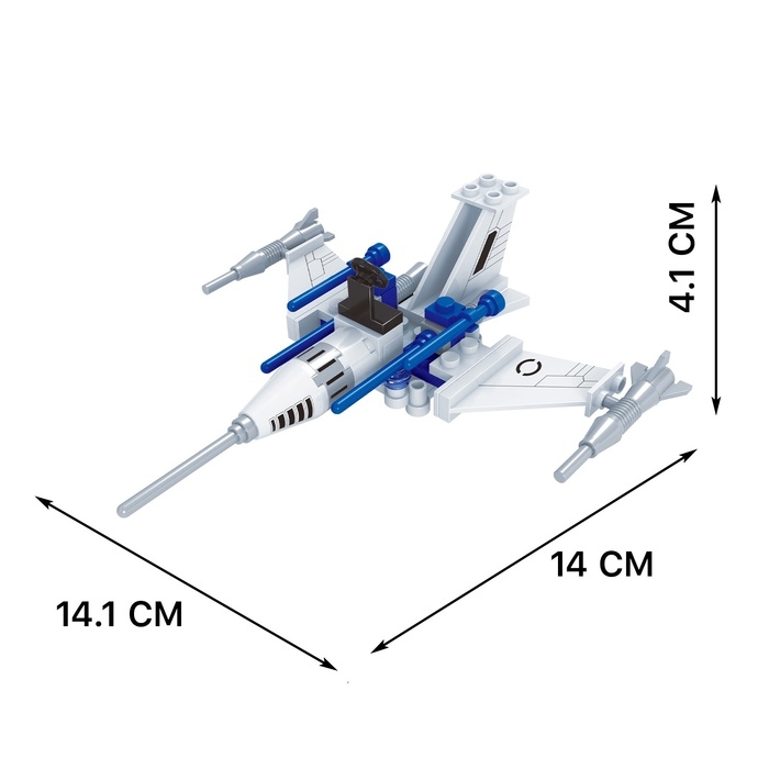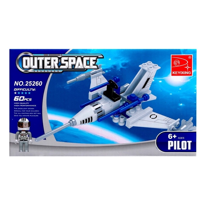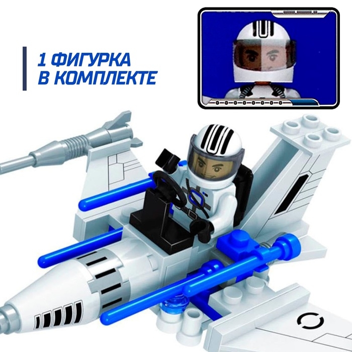 С набором торговой марки Ausini мальчишка покорит галактику на сверхмощном истребителе. Воздушное судно выполнено в виде космолёта, пилота защищает герметичный костюм, для атаки кораблей противника предусмотрены ракеты.