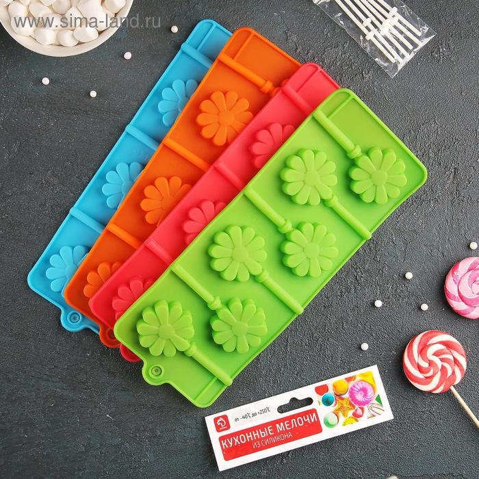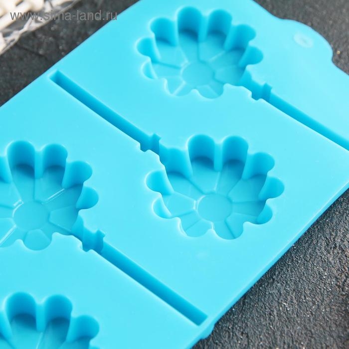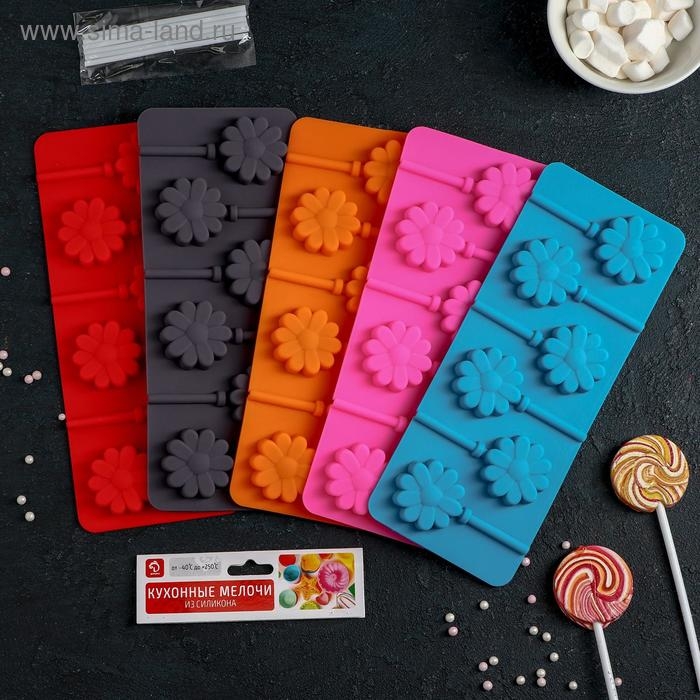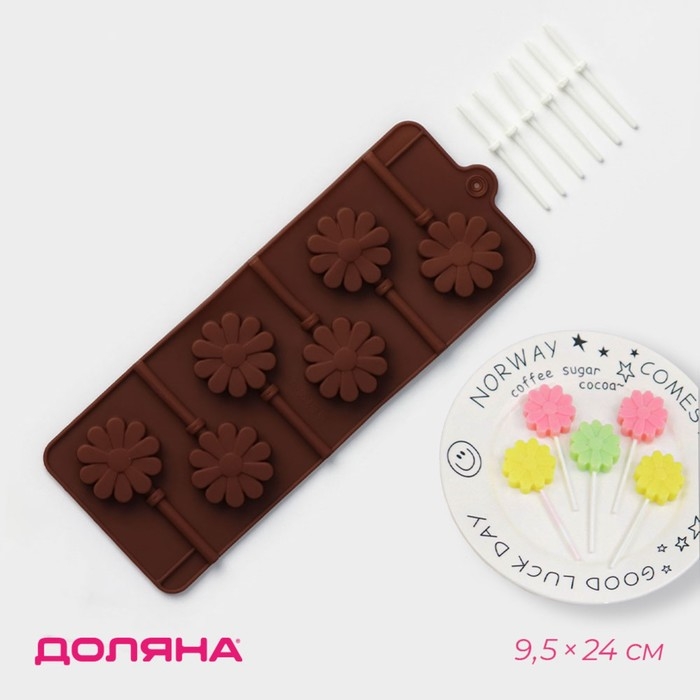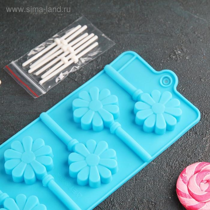 Форма для леденцов Доляна «Ромашка», силикон, 9,5×24×1 см, 6 ячеек (d=3,8 см), с палочками, цвет МИКС