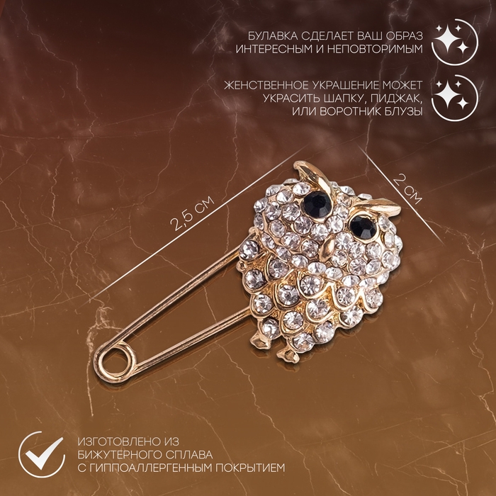 Это украшение – настоящая находка для модниц, предпочитающих нетривиальные аксессуары. Брошь-булавка станет не только оригинальным дополнением вашего наряда, но и позволит без труда приколоть при необходимости палантин или шейный платок. Используйте ее в качестве украшения шляпки, рубашки или галстука. Булавка «Филин», 2,5 см, цвет чёрно-белый в золоте внесет особую нотку изящности в ваш образ и придаст ему еще больше очарования. Брошь выполнена из металла и украшена россыпью страз, игриво переливающихся на свету.