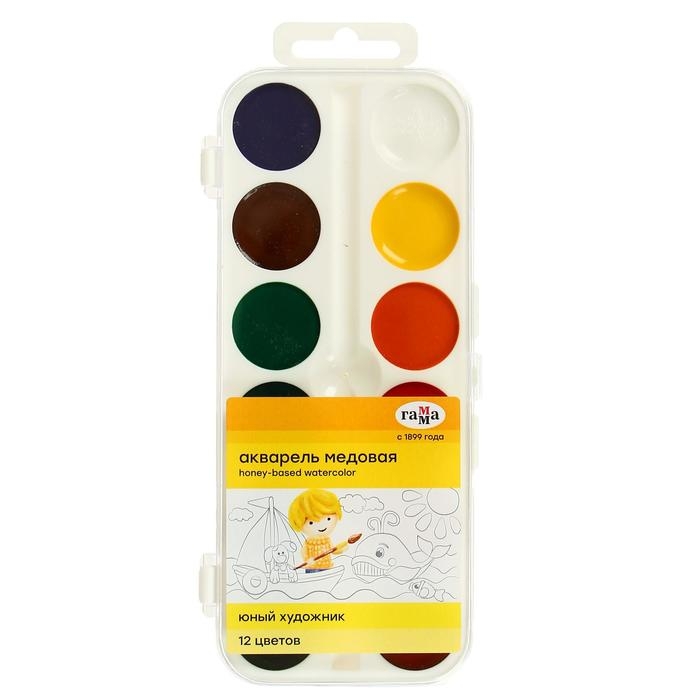 Акварель 12 цветов "Гамма" "Юный художник", медовая, без кисти, пластик