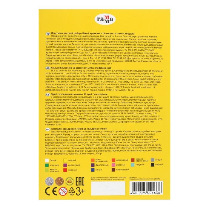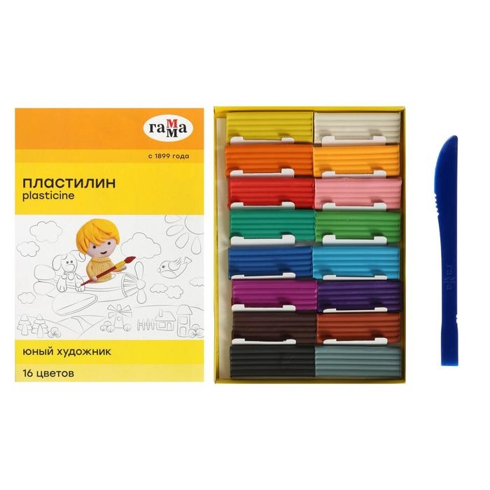 Пластилин 16 цветов 224 г, Гамма "Юный художник", со стеком, картонная упаковка 280046