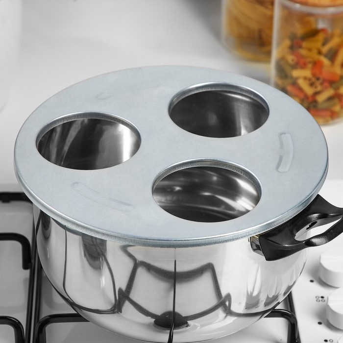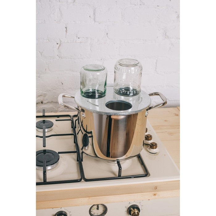 Стерилизатор для банок (трёхместный) – металлическая насадка, которая может превратить вашу кастрюлю или чайник в установку для стерилизации банок горячим воздухом. Стерилизатор делает процесс загрузки банки комфортным, препятствует разбрызгиванию кипятка. При стерилизации таким способом можно предотвратить утечку пара, и связанный с ним нагрев и увлажнение помещения. Банка плотно и герметично прижимается к отверстию под собственным весом, а процесс паровой обработки происходит быстро и эффективно.