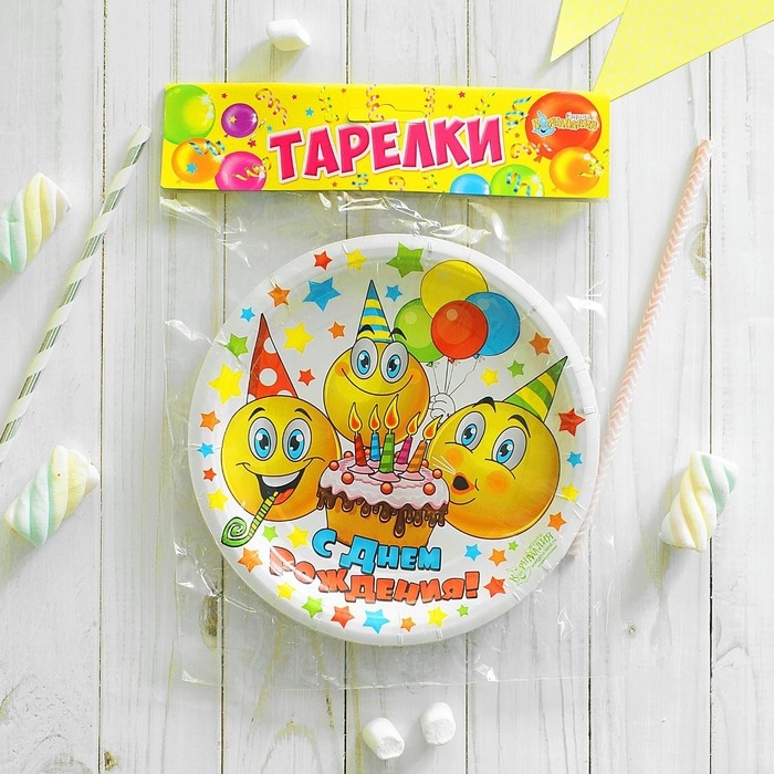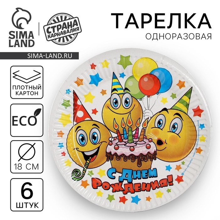 Тарелка одноразовая бумажная "С днем рождения"смайлики и тортик, набор 6 шт, 18см