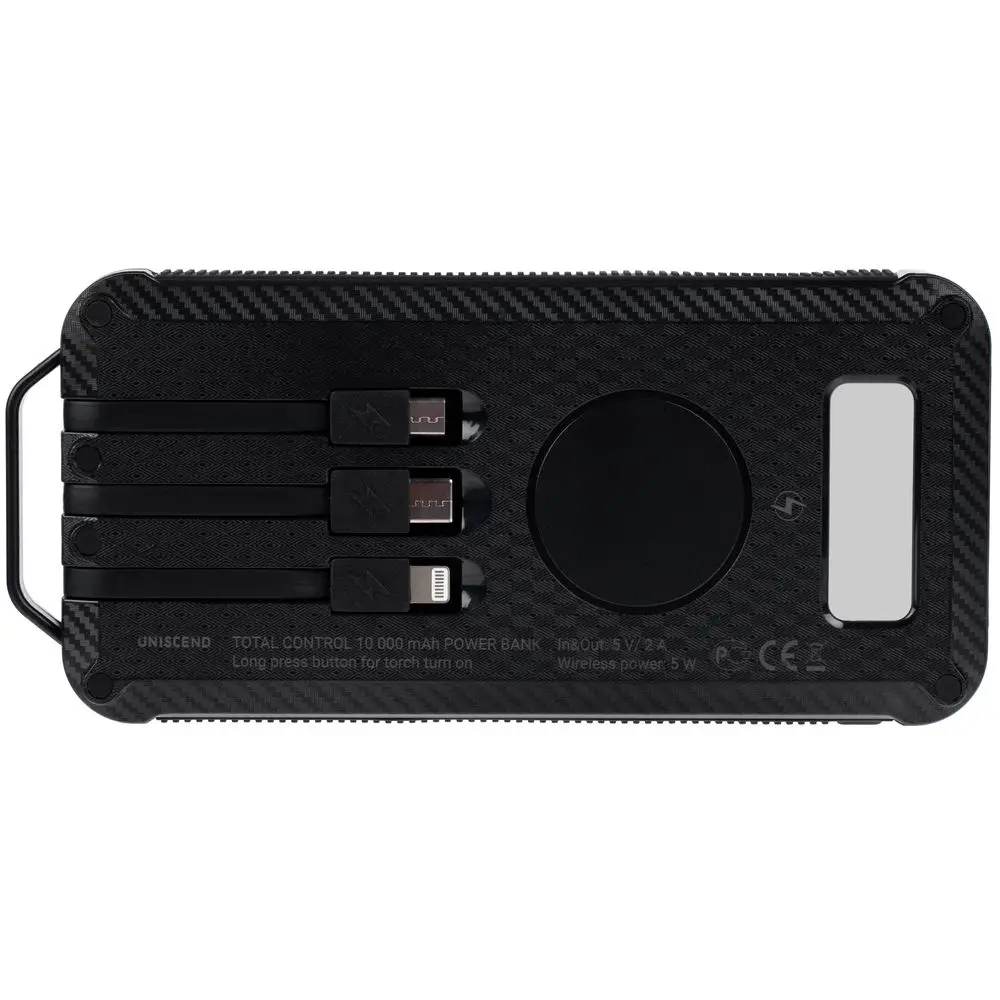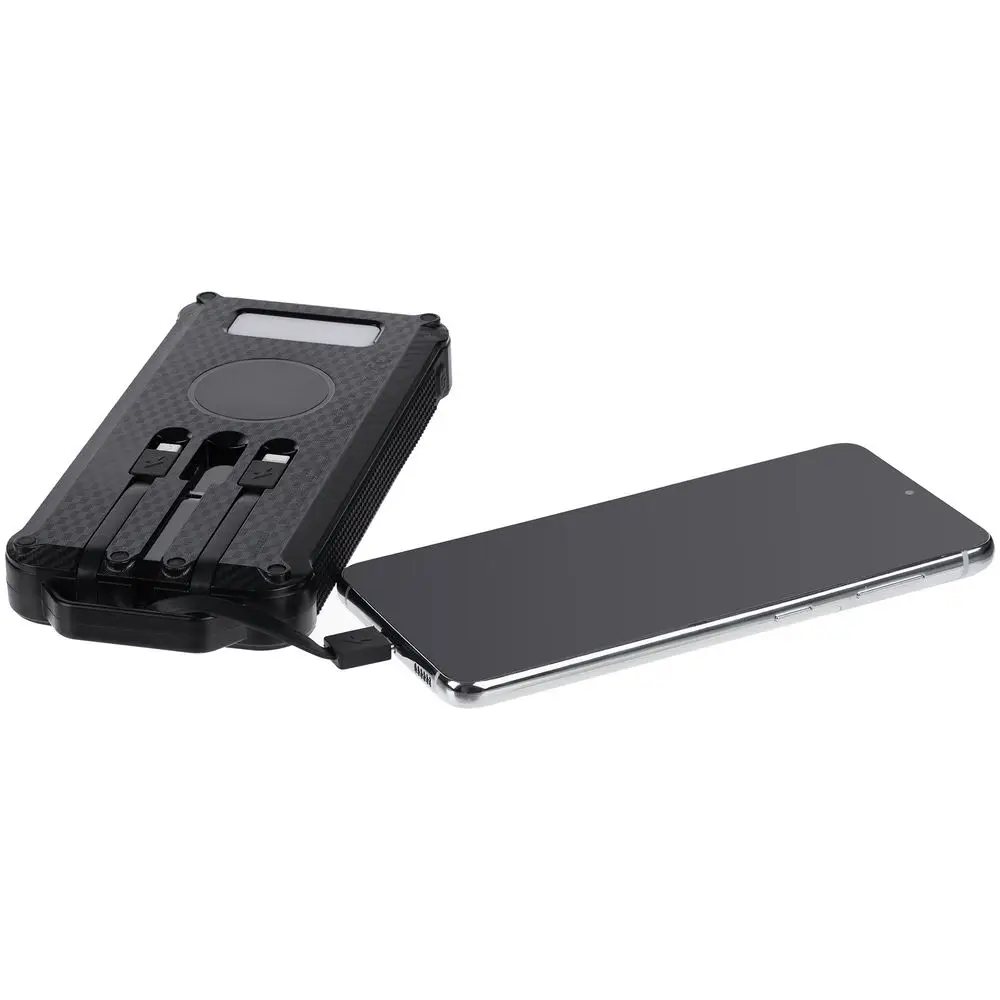 Total Control — настоящий outdoor-аккумулятор с ударопрочным корпусом и защитой от пыли и брызг, который не страшно взять в поход. Область для беспроводной зарядки и 3 встроенных кабеля с разъемами Micro USB, Type C и Lightning позволяют удобно заряжать разные типы устройств, а солнечная батарея просто не позволит остаться совсем без связи. Яркий фонарик осветит путь или послужит светильником в палатке.