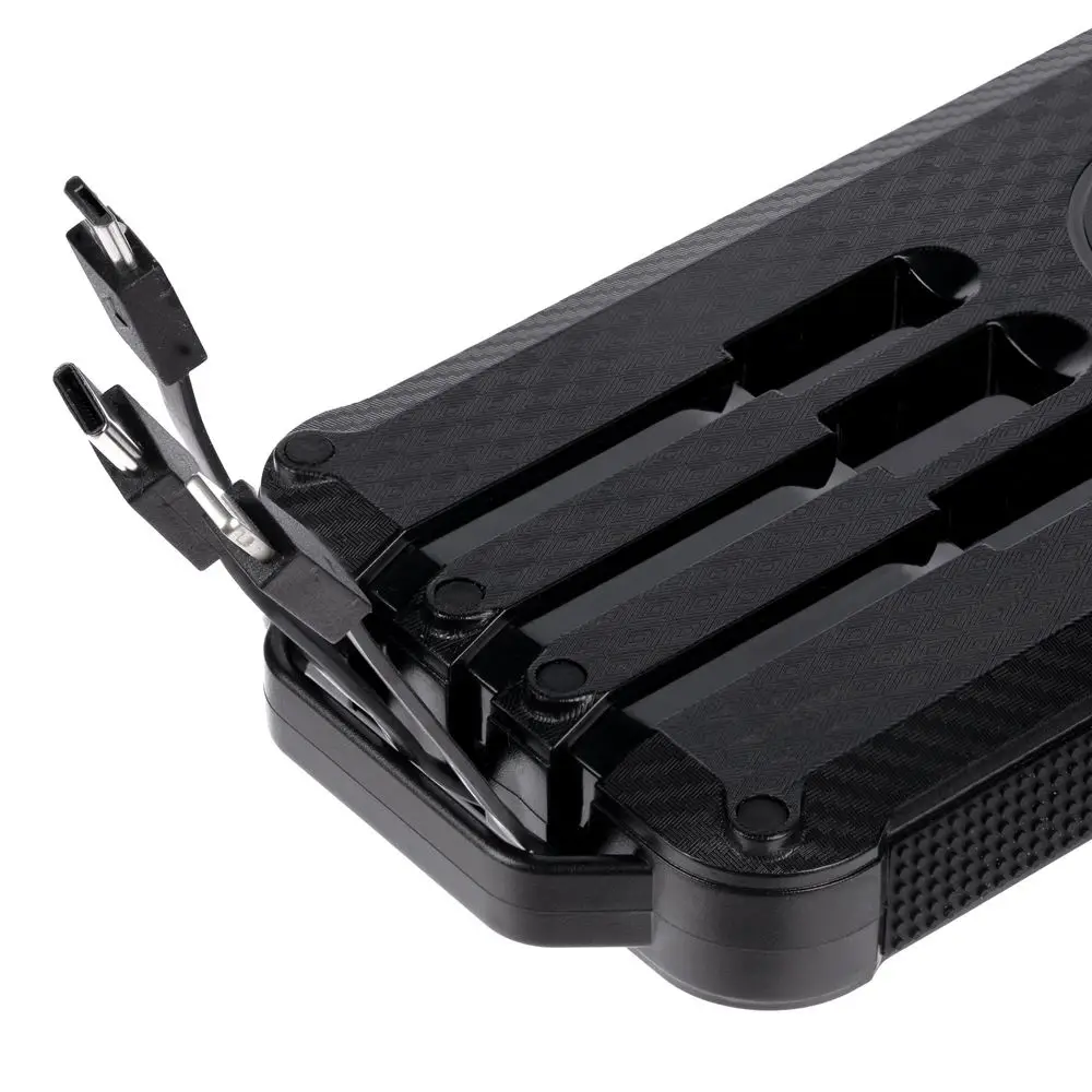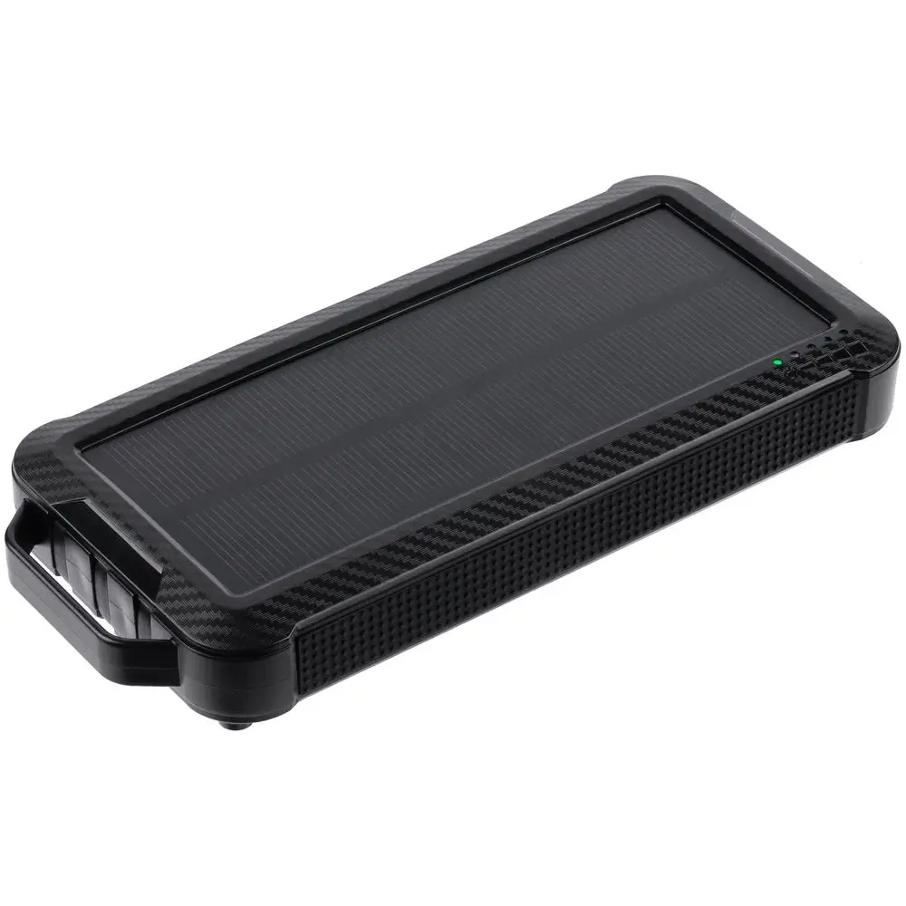 Прорезиненные вставки и рисунок на корпусе с имитацией карбона добавляют хорошей агрессивности внешнему виду аккумулятора — сразу видно, что его хозяин готов к приключениям.