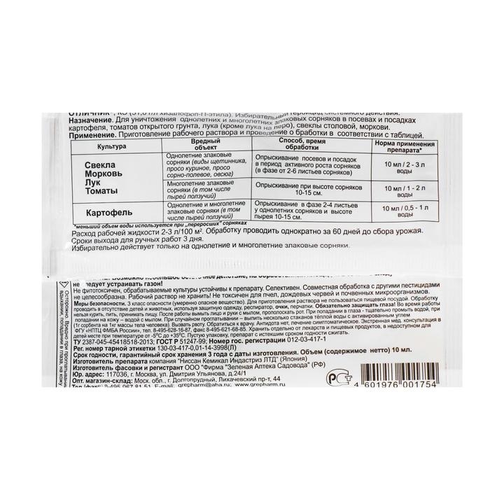 - Средство эффективно только против однолетних и многолетних злаковых сорняков.