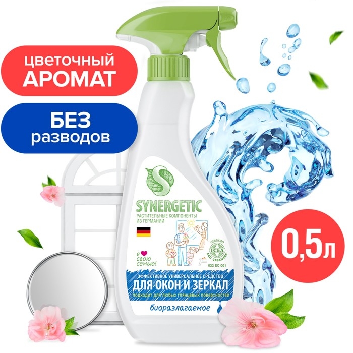 Биоразлагаемое средство для мытья стекол, зеркал и бытовой техники SYNERGETIC - эффективное и универсальное средство для бережного очищения стеклянных, зеркальных и других глянцевых поверхностей. Не требует смывания, улучшает светопроницаемость стекла. Комплекс мягких биоразлагаемых Н-тензидов и изопропилового спирта высокой степени очистки обеспечивает высокое качество уборки стеклянных и глянцевых поверхностей, быстро и эффективно удаляя загрязнения без разводов. Средство образует защитную пленку от пыли и грязи, облегчает последующее мытье поверхностей, не требует смывания и обладает антибактериальным эффектом. Гипоаллергенная парфюмерная композиция на основе эфирных масел герани, мирта, жасмина и ветивера придает средству и очищенным поверхностям приятный цветочный аромат, который подходит даже для людей с чувствительной кожей. Международный экологический сертификат ICEA подтверждает биоразлагаемость, безопасность и эффективность средства.Средство подходит для септических установок. Попадая в среду септика, оно "понятно" для микроорганизмов и без труда распадается на простые соединения. Достаточное количество средства нанести на обрабатываемую поверхность, выдержать 10 - 15 секунд, насухо протереть подходящей тканью. Не требует смывания водой. Беречь от детей. При попадании средства в глаза промыть водой. Использовать строго по назначению. Подготовленная вода ˃ 30%; А-тензиды (ПАВ из растительного масла) 5-15%; Н-тензиды (ПАВ из растительного масла) ˂ 5%; глицерин растительного происхождения ˂ 5%; гипоаллергенная парфюмерная композиция «Яблоко» на основе эфирных масел герани, петитгрейна, сантала, бергамота; пищевой краситель.