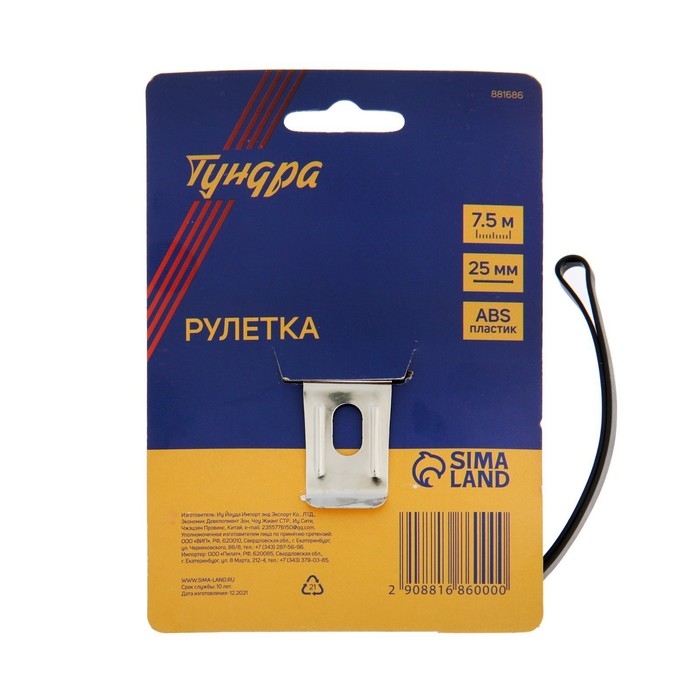 Рулетка ТУНДРА, пластиковый корпус, 7.5 м х 25 мм
