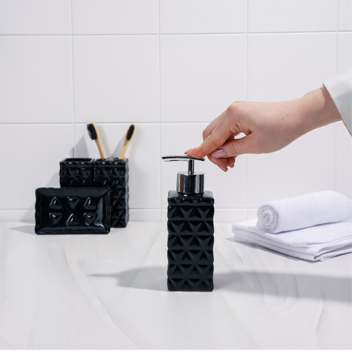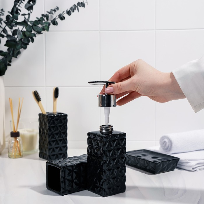 Набор аксессуаров для ванной комнаты «Ромбы», 4 предмета (дозатор 230 мл, мыльница, 2 стакана), цвет чёрный