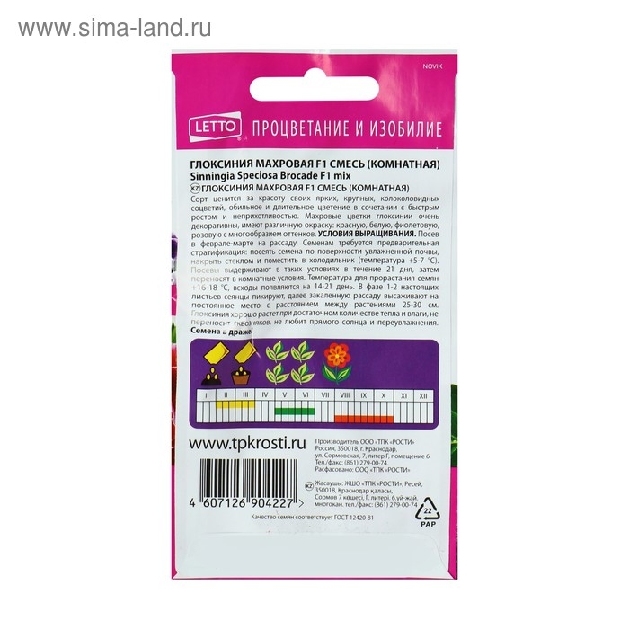 Условия выращивания:посев в феврале - марте на рассаду.Семенам требуется предварительная стратификация:посеять семенами по поверхности увлажненной почвы,накрыть стеклом и поместить в холодильник (температура +5+7°С).Посевы выдерживают в таких условиях в течение 21 дня, затем переносят в комнатные условия.Температура прорастания семян +16+18°С, всходы появляются на 14-21 деньВ фазе 1-2 настоящих листьев сеянцы пикируют, далее закаленную рассаду высаживают на постоянное место на расстоянии 25-30 см.Глоксиния хорошо растет при достаточном количестве тепла и влаги, не переносит сквозняков, не любит прямого солнца и переувлажнения.