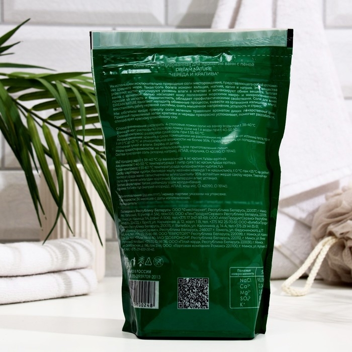 Соль с пеной для ванн Dream Nature Ароматизированная Череда и крапива, 900 г. Экологически чистая морская соль имеет уникальные биологические свойства, содержит богатый набор микроэлементов, необходимых для нормального функционирования организма. Морская соль используется для обогащения воды минералами моря. Соль обладает успокаивающим действием, снимает нервное напряжение, улучшает кровообращение и сон.