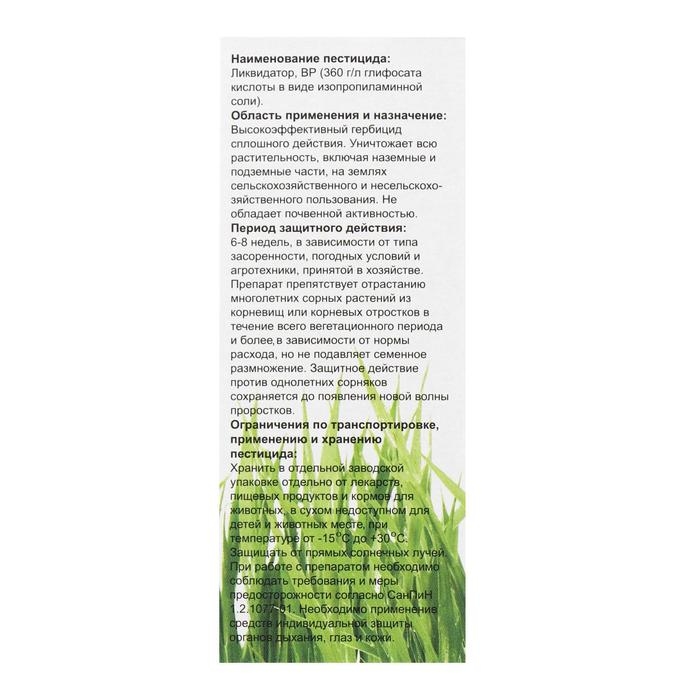 ПРЕПАРАТИВНАЯ ФОРМА: водный раствор. Просто нанесите небольшое количество жидкости на сорняк или борщевик, и уже через несколько дней вы увидите результат. Ваш сад или огород станет чистым и ухоженным, без единого сорняка! Этот продукт содержит специальный состав, который эффективно уничтожает сорняки, не повреждая при этом другие растения. Благодаря своей концентрированной формуле, Ликвидатор обладает мощным действием и гарантирует быстрый результат. Не теряйте время на прополку и борьбу с сорняками вручную - приобретите средство Ликвидатор и наслаждайтесь красивым и ухоженным садом без лишних усилий. Защитите свои растения от нежелательных гостей с помощью этого эффективного средства!
