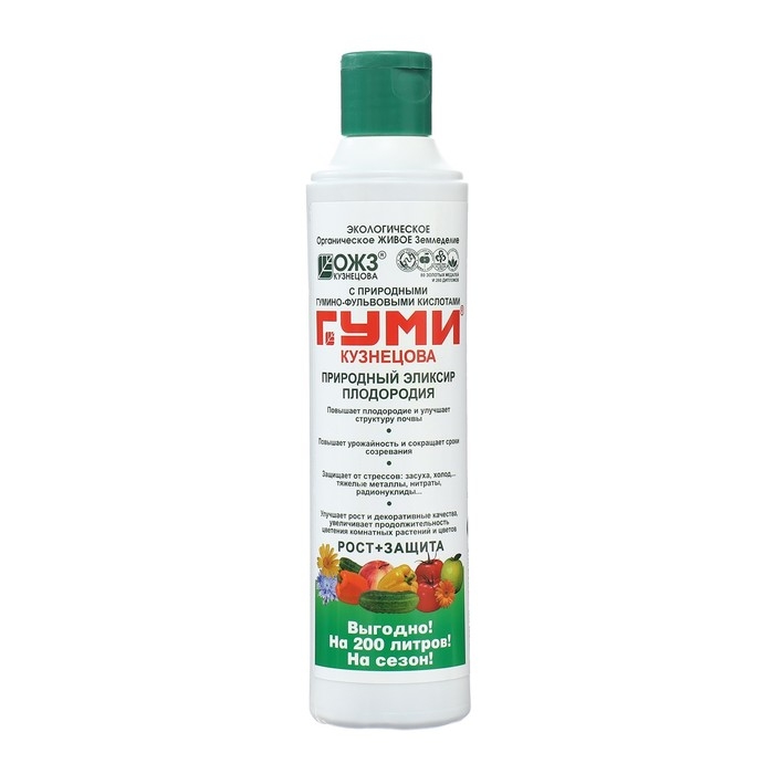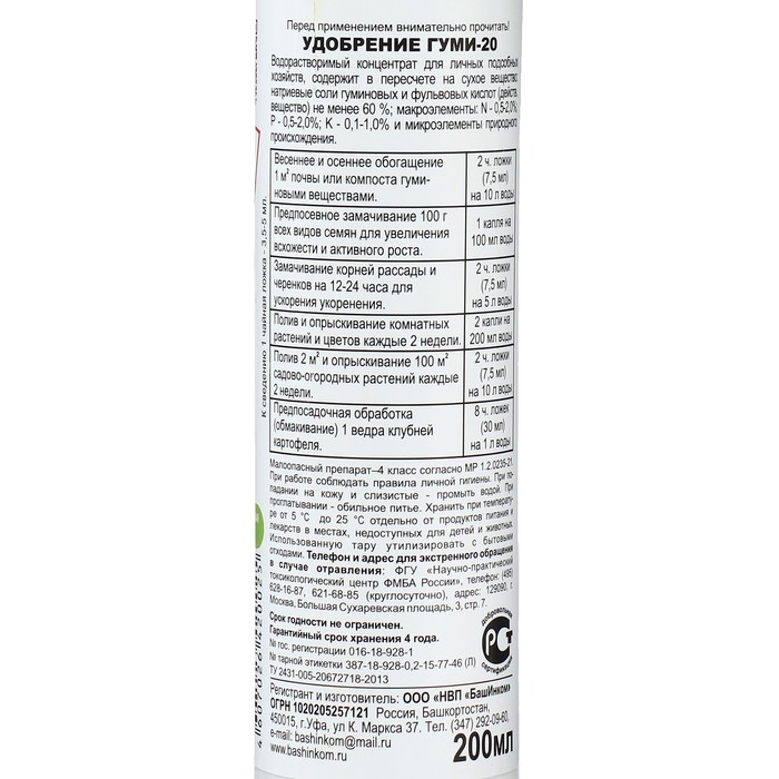 Состав: водный раствор гумата натрия, азот, фосфор, калий, микроэлементы природного происхождения, гумат натрия (в пересчёте на сухое вещество — не менее 60 %; B (2 200‒2 600 мг/кг).