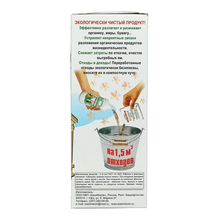 Микробиологический препарат пригодится для дачных туалетов, выгребных ям, биотуалетов. Действующими веществами являются споры и живые клетки бактерий. Средство эффективно разлагает органику, фекалии, жиры, бумагу, устраняет неприятные запахи разложения органических продуктов жизнедеятельности.