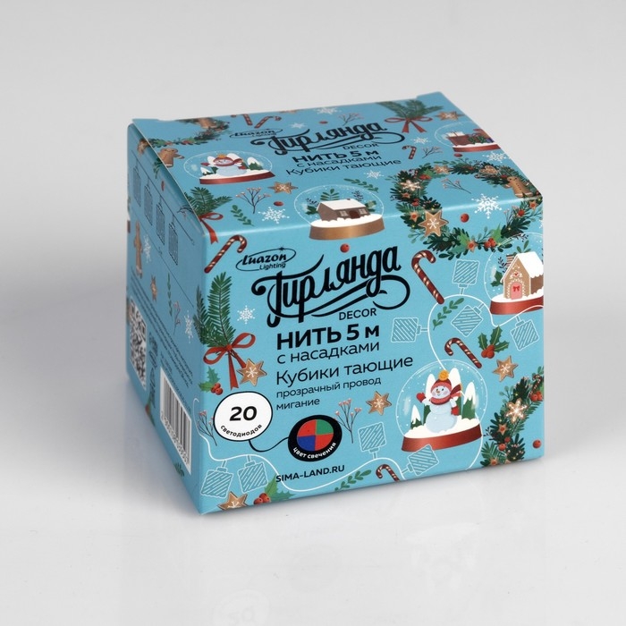 Гирлянда «Нить» 5 м с насадками «Кубики тающие», IP20, прозрачная нить, 20 LED, свечение мульти (RG/RB), мигание, 220 В