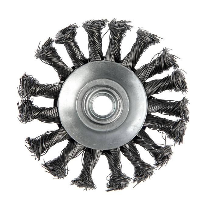 Металлическая кручёная щётка типа «тарелка» ТУНДРА предназначена для грубой зачистки изделий из различных материалов, удаления ржавчины и грязи с металлических поверхностей. Применяется совместно с угловой шлифовальной машиной, тип крепления - М14.