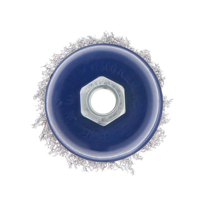 Металлическая щётка чашечного типа ТУНДРА предназначена для зачистки, шлифования, полирования, матирования изделий из различных материалов, удаления ржавчины и грязи с металлических поверхностей в щадящем режиме. Применяется совместно с угловой шлифовальной машиной, тип крепления - М14.