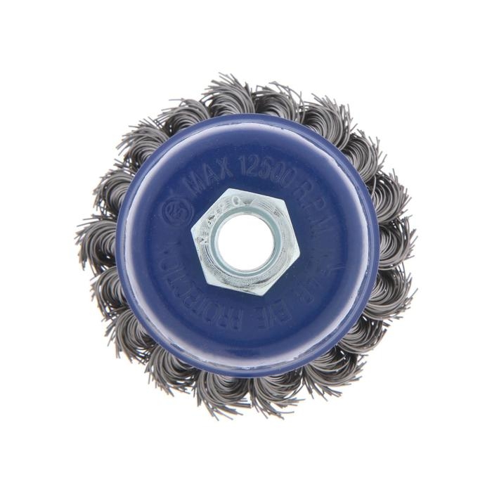 Металлическая кручёная щётка чашечного типа ТУНДРА предназначена для грубой зачистки металлических поверхностей от ржавчины и грязи, удаления неровностей и сглаживания сварных швов. Применяется совместно с угловой шлифовальной машиной, тип крепления - М14.