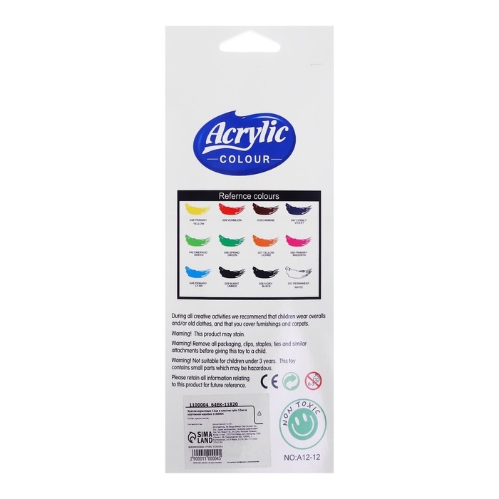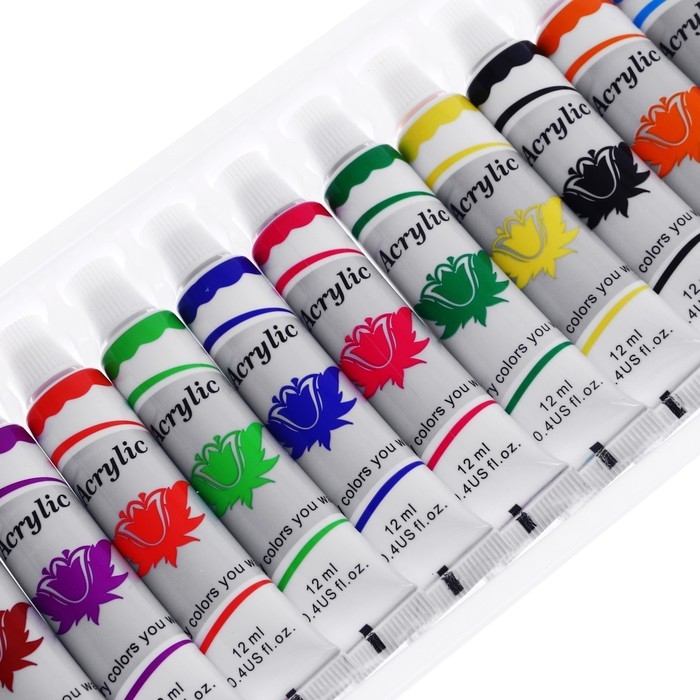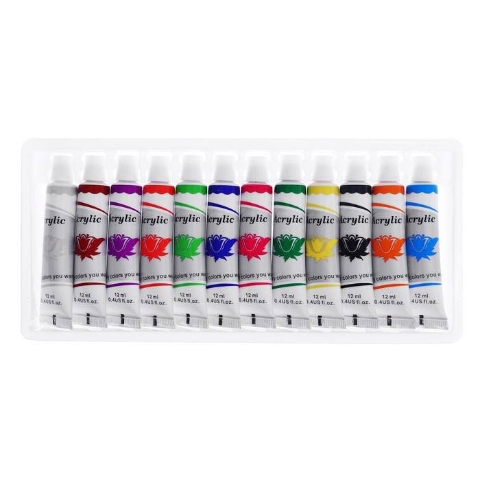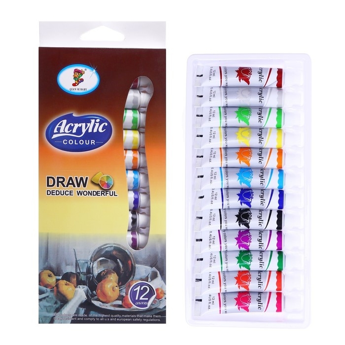 Краски акриловые, 12 цветов, в пластиковой тубе, 12 мл, в картонной коробке