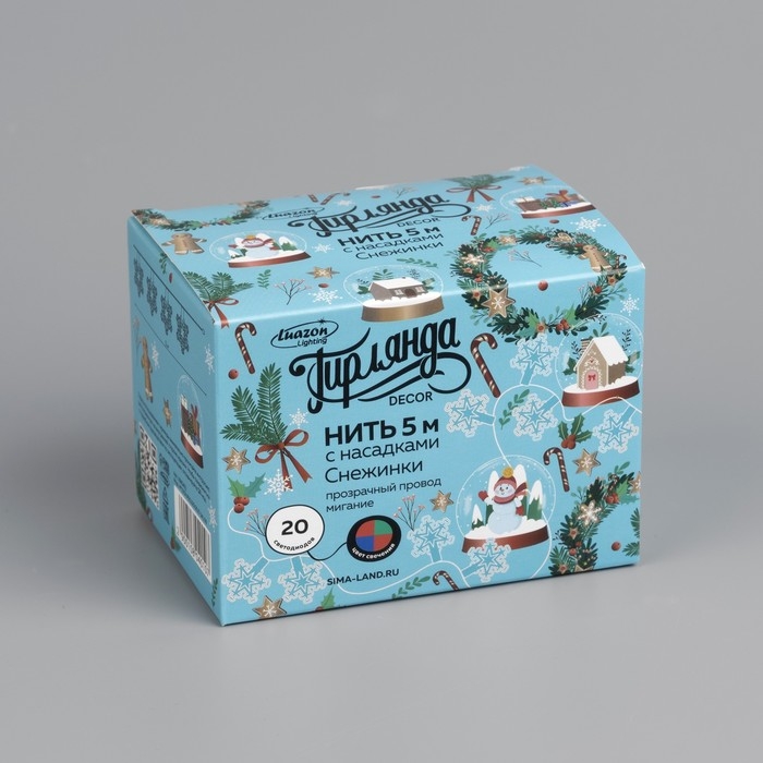 Гирлянда «Нить» 5 м с насадками «Снежинки», IP20, прозрачная нить, 20 LED, свечение мульти (RG/RB), мигание, 220 В