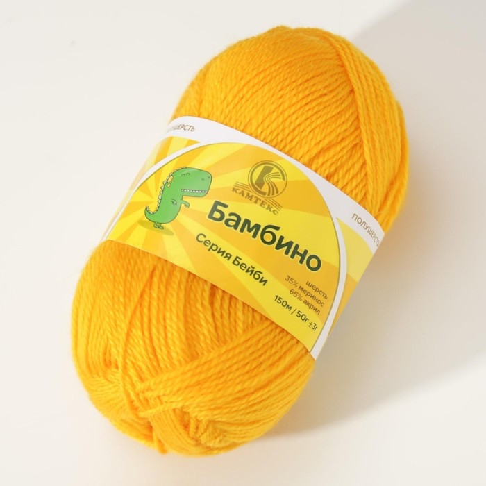 Пряжа "Бамбино" 35% шерсть меринос, 65% акрил 150м/50гр (104, желтый), в составе которой присутствует акрил и элитная мериносовая шерсть, отличающаяся особым тонким, длинным и мягким волокном. Среди рукодельниц этот вид пряжи особо любим, ведь из неё легко, быстро и аккуратно вяжутся все изделия. Именно эту пряжу выбирают для создания детских вещей, и даже грудничкам вяжут различные пинетки, костюмчики, шапочки. Ниточка гладкая и шелковистая, ровно ложится в узор или рисунок, она абсолютна гипоаллергенна и не раздражает нежную кожу малыша. А благодаря выгодному сочетанию состава в вещах из «Бамбино» уютно в любое время года. Зимой — тепло, а летом — не жарко. Кроме того, за счёт мериносовой шерсти исключается «парниковый эффект», так как она отлично впитывает влагу.