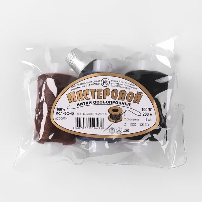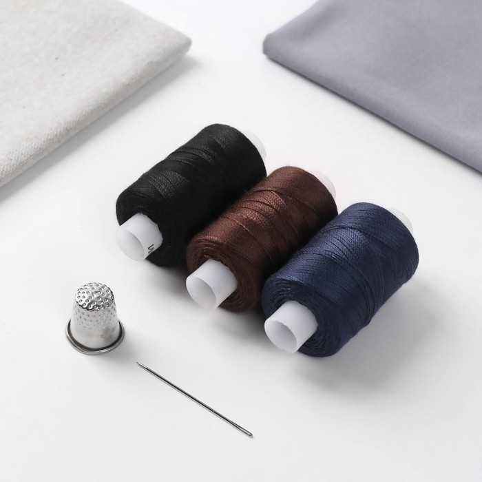 Набор ниток «Мастеровой», 100ЛЛ, 200 м, 3 шт, иголка, напёрсток, цвет чёрный/коричневый/синий