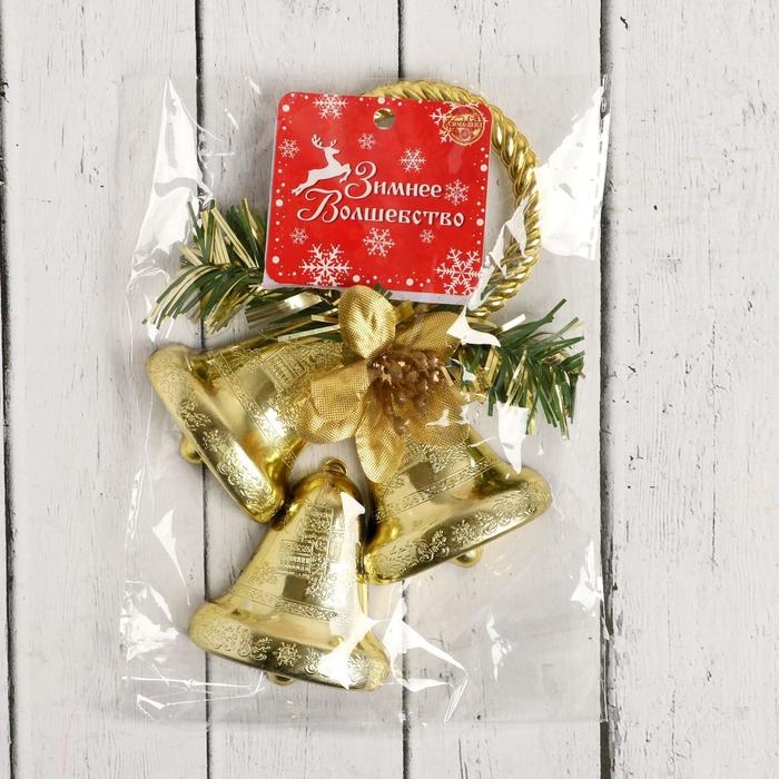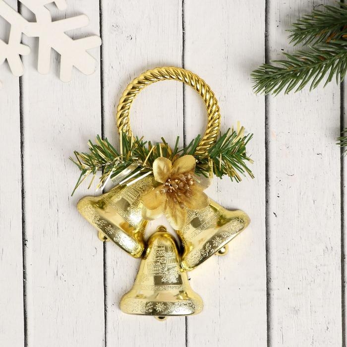 Украшение новогоднее "Три колокольчика с цветком на кольце" 10х14,5 см, золото