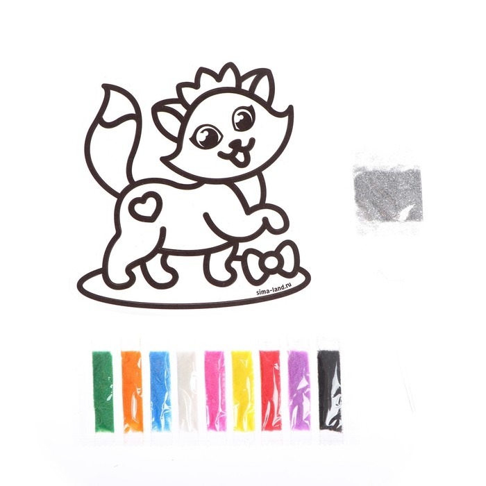 Фреска форменная с блёстками «Кошечка» - это увлекательный вид творчества, который понравится любому малышу. Клеевая основа защищена специальным слоем бумаги, на который нанесены прорезные контуры. Каждый цвет находится в своей зоне: отделяйте верхний слой с помощью стеки и засыпайте песком подходящего оттенка. Специальные контуры не дадут разноцветным частичкам перемешаться и помогут с лёгкостью создать сверкающий шедевр. Засыпайте картинку постепенно и не забывайте распределять мелкие блёстки по клеевому слою, чтобы добиться особой яркости изображения.