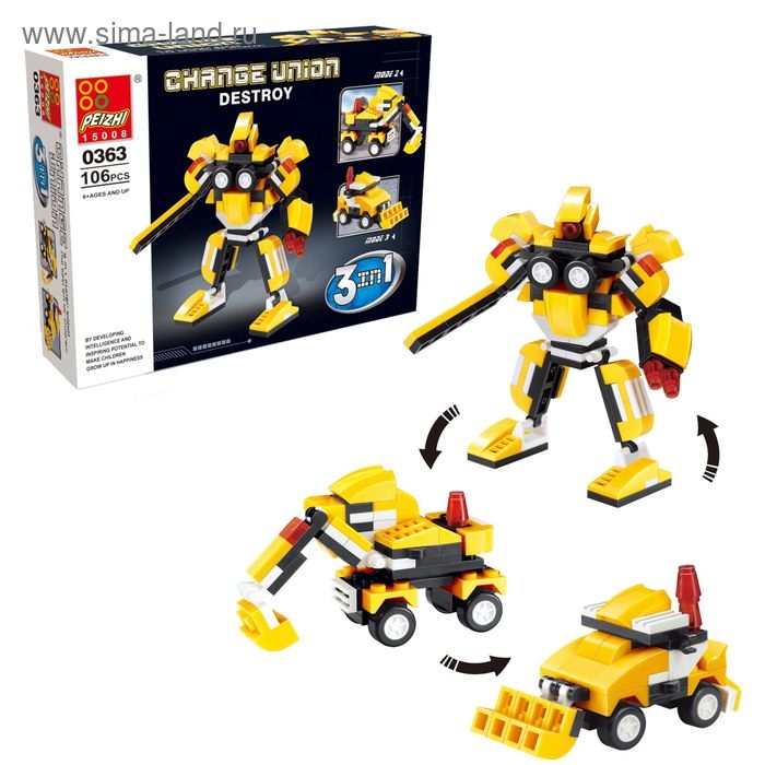 Неуязвимый воин торговой марки Peizhi способен принимать форму строительной техники. Робот меняет модификацию соответственно случаю. В обычный день машина расчищает и утилизирует космический мусор, а во время атаки межгалактических захватчиков за несколько простых движений перевоплощается в непобедимого кибервоина. Мальчишка сам выберет сценарии для игры и соберёт одну из трёх моделей робота.