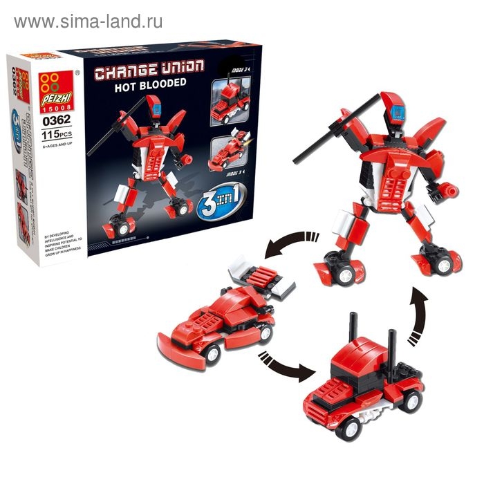 «Робот» торговой марки Peizhi способен выиграть любые скоростные соревнования. Герой за несколько простых движений перевоплощается в гоночный болид или мощный тягач. Мальчишка с удовольствием будет управлять техникой и кибергонщиком и станет чемпионом заезда.