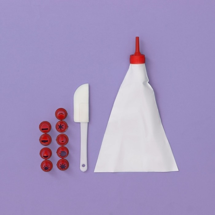В комплект входят 9 насадок, которые способны удовлетворить даже самому взыскательному вкусу,специальный мешок и небольшая лопатка, при помощи которой можно переворачивать и перемещать крем, украшать готовое изделие. Консистенция используемой мастики для декора может меняться(от тугой до кремообразной). Тесто не должно быть слишком жидким, иначе оно будет расползаться.