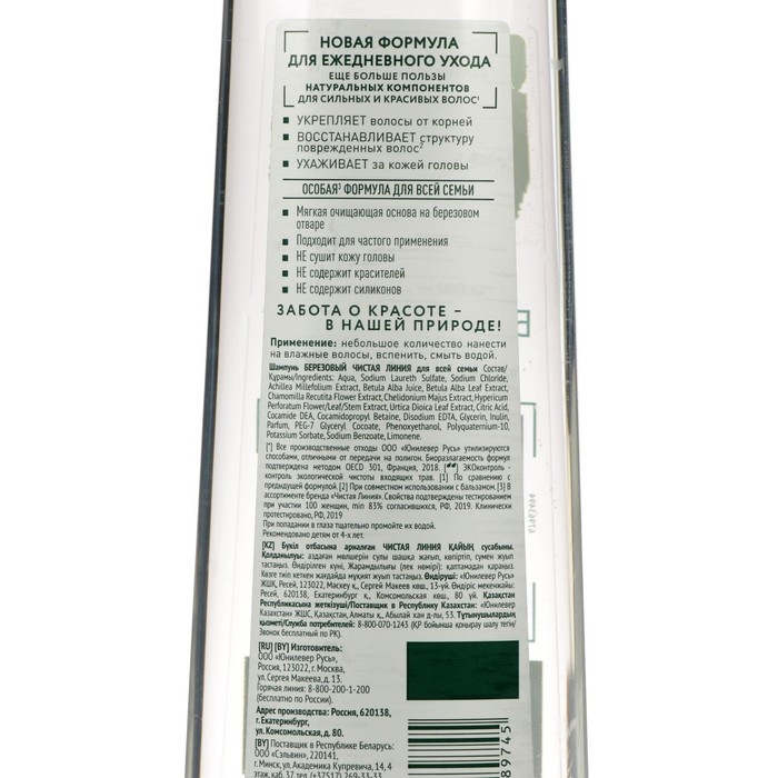 В его состав входит мягкая основа на берёзовом отваре без красителей, которая не сушит кожу и делает волосы крепкими и мягкими, оздоравливая кожу головы.