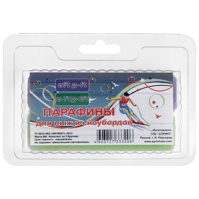 Парафин позволяет улучшить скоростные характеристики. По цвету бруска можно определить, для каких погодных условий он предназначен. Парафины подходят для сноубордов, а также пластиковых и деревянных лыж. На упаковке указаны и выделены цветом соответствующие температурные режимы.