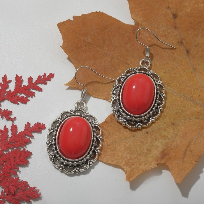 Серьги «Натурель» овал в кайме, цвет красный в чернёном серебре