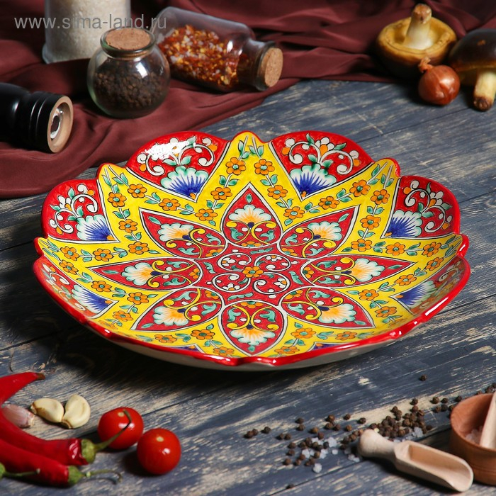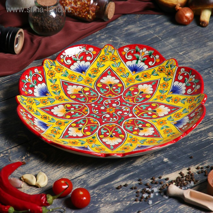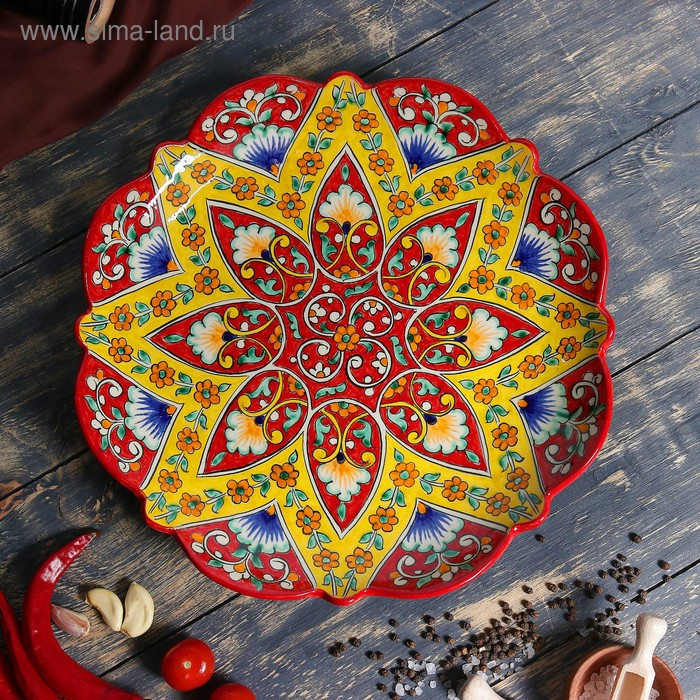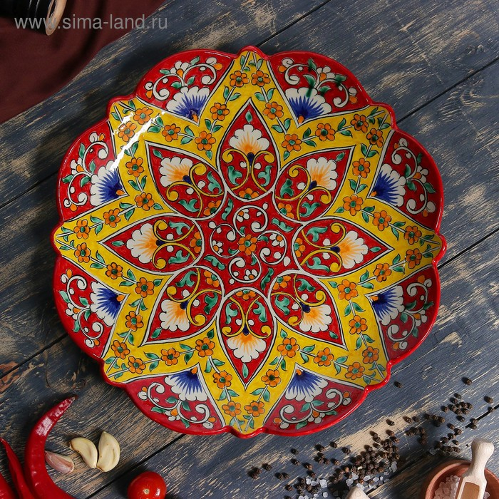 Ляган Риштанская Керамика "Цветы", 32 см, красный, рифлённый