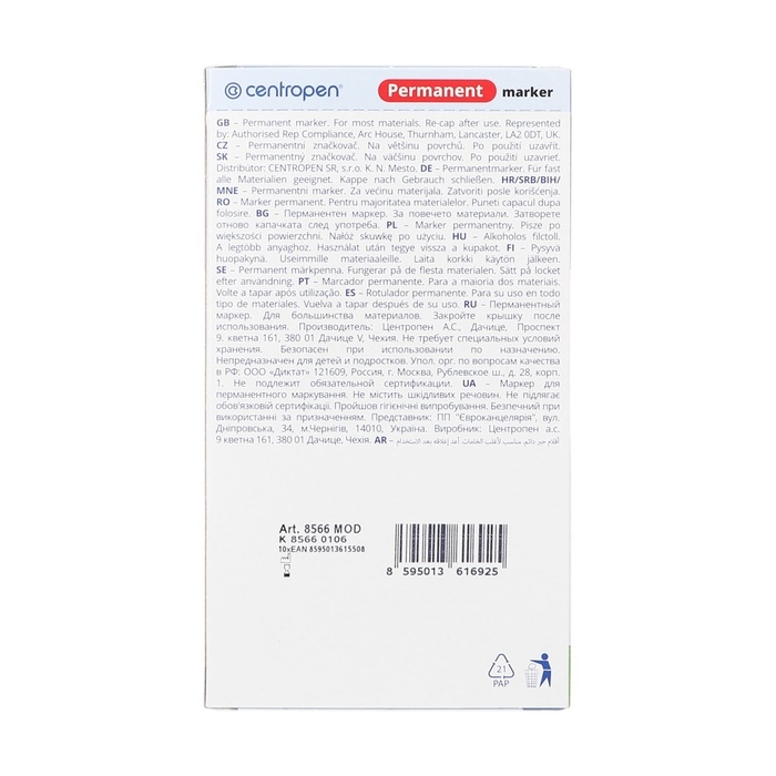 Centropen 8566 — это перманентый маркер, который предназначен для письма на любых поверхностях.