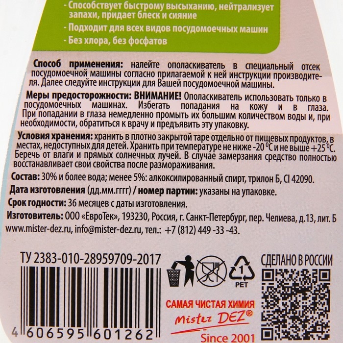 Ополаскиватель для посудомоечной машины Mister Dez эффективно ополаскивает посуду, придает ей блеск, удаляет разводы. Товар сертифицирован.