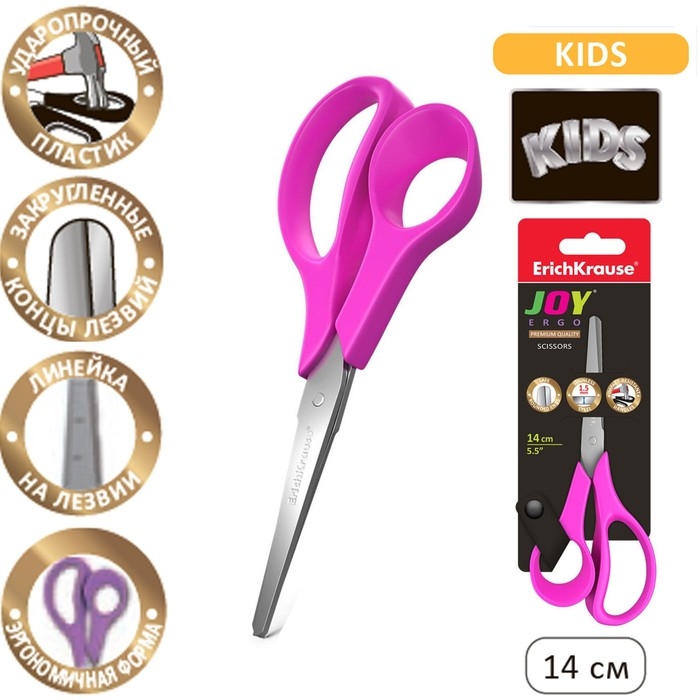Ножницы детские 14 см, ErichKrause Joy Ergo, с закруглёнными концами лезвий и линейкой, МИКС