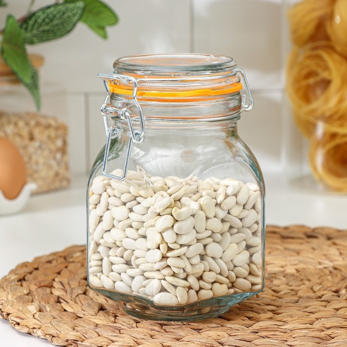 Банка для сыпучих продуктов изготовлена из стекла. Имеет плотно закрывающуюся крышку, которая защищает продукты от влаги и посторонних запахов. В ёмкости удобно хранить крупы, специи, макаронные изделия, сахар, муку и бобовые.